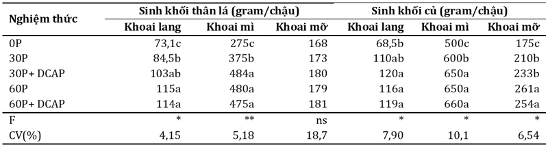 Bảng 1. Ảnh hưởng của bón lân phối trộn DCAP đến sinh khối khoai lang, khoai mì và khoai mỡ